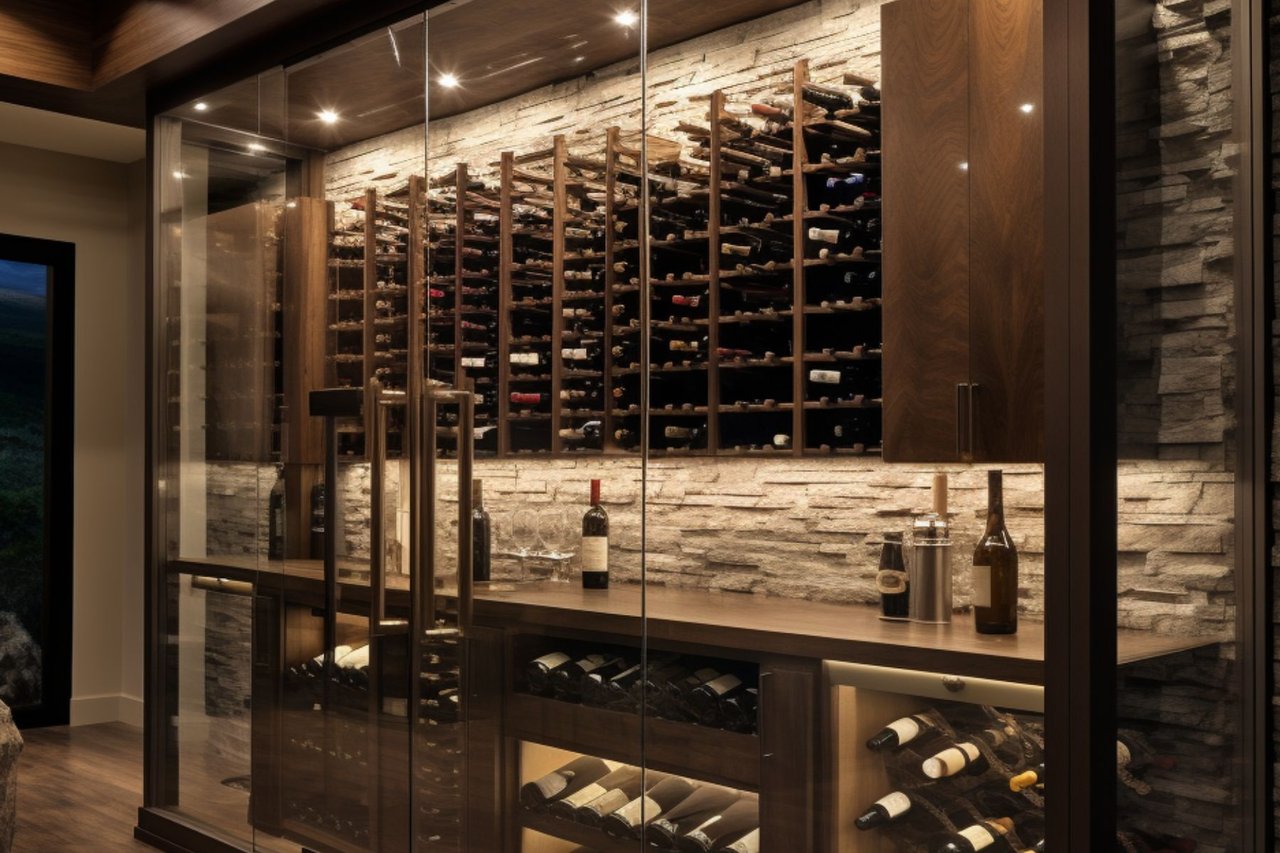 Natural materials — stone, white brick, black-framed windows, and warm wood accents